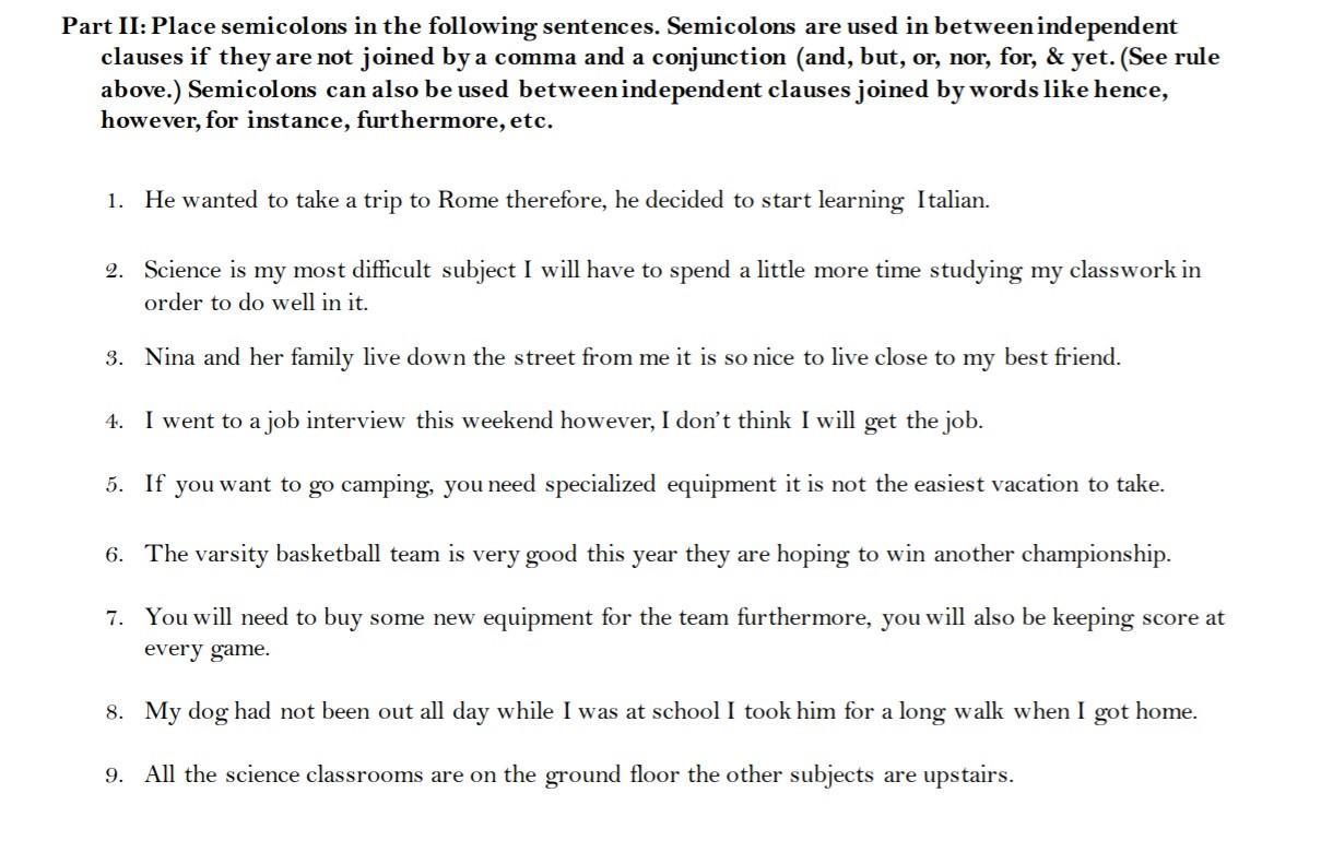 -We will review the use of semicolons. I have attached the worksheet and I will also attach a video with explanations. I will guide you through it. This is NOT for a grade. It is just practice and review.